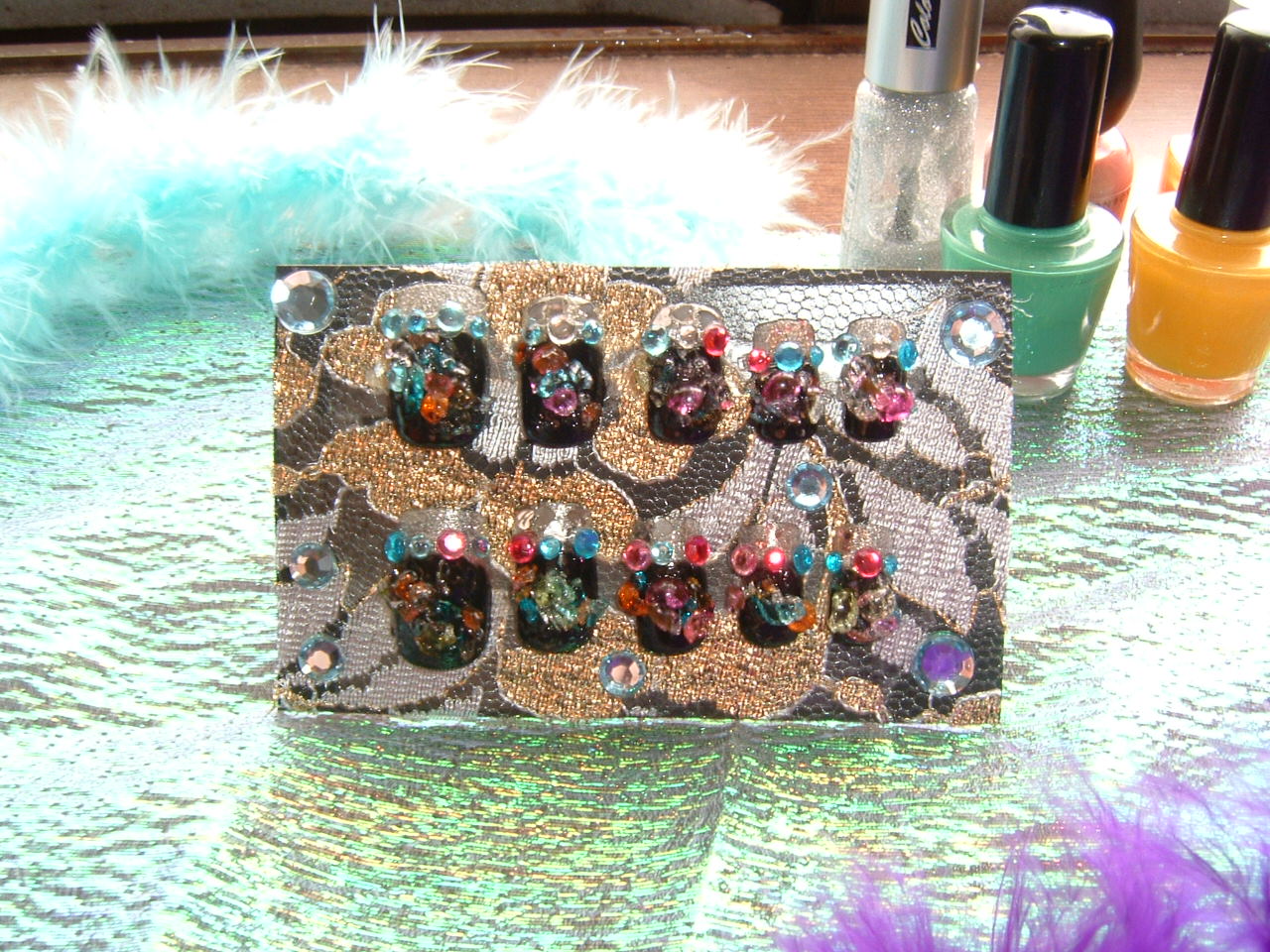 シックな大人の黒に、輝きを放つ色とりどりのストーンを砕いた物をデコレーションしました。 普段からご使用いただけるデザインです。 かっこよく決めたい方にお勧めです!!